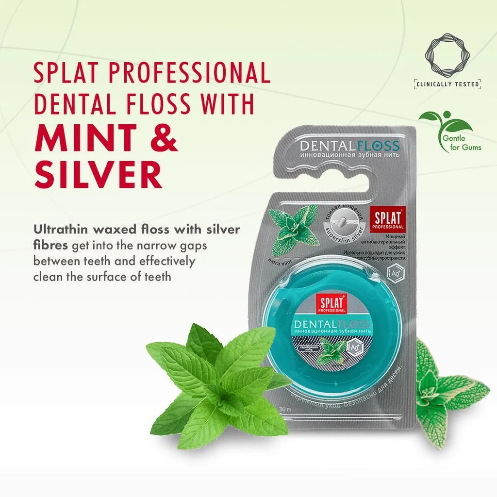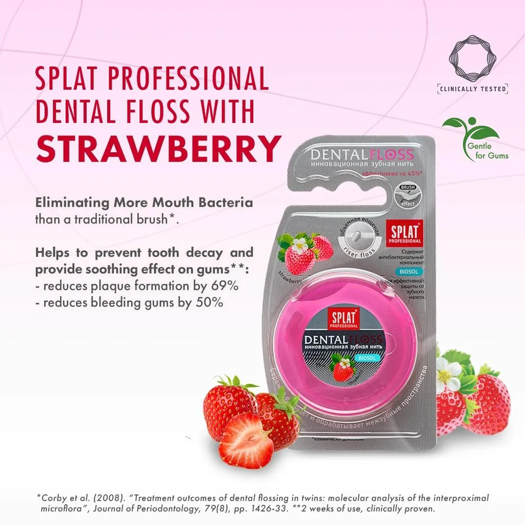 SPLAT Dental Floss is a high-quality dental floss that is available in three different flavors: Mint and Silver, Strawberry, and Bergamot and Lime. It is made with a unique technology that allows it to expand when used, providing a more effective clean between teeth.